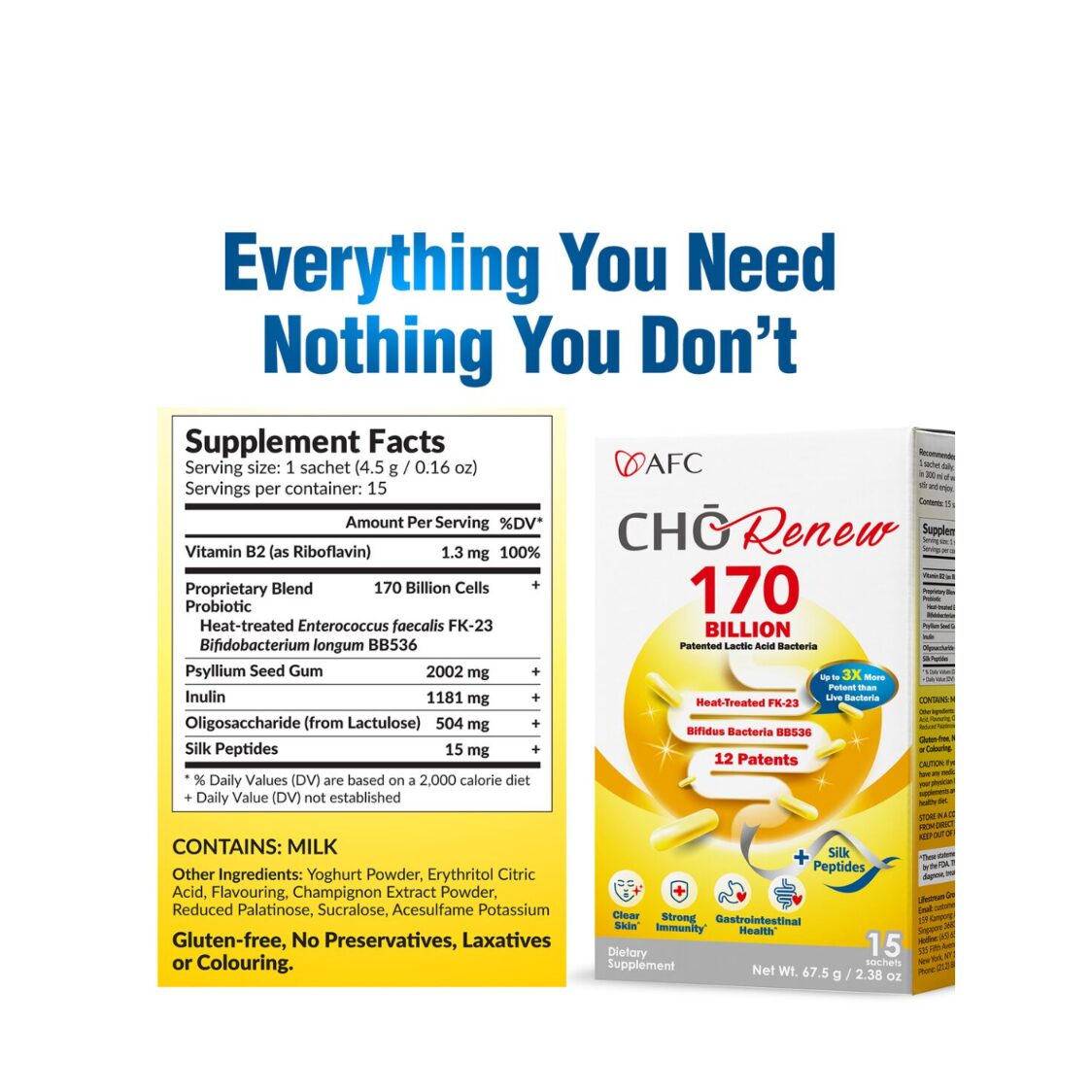 AFC Cho Renew is a proprietary intestinal health formula that contains 170 billion probiotics for stronger immunity, cleaner intestines and clearer skin by restoring gut flora balance. LAB are most beneficial and fast colonizing probiotic sources, and when consumed in adequate amounts have been shown to aid digestion and re-balance gut flora, providing relief from the following health issues related to poor gut health.