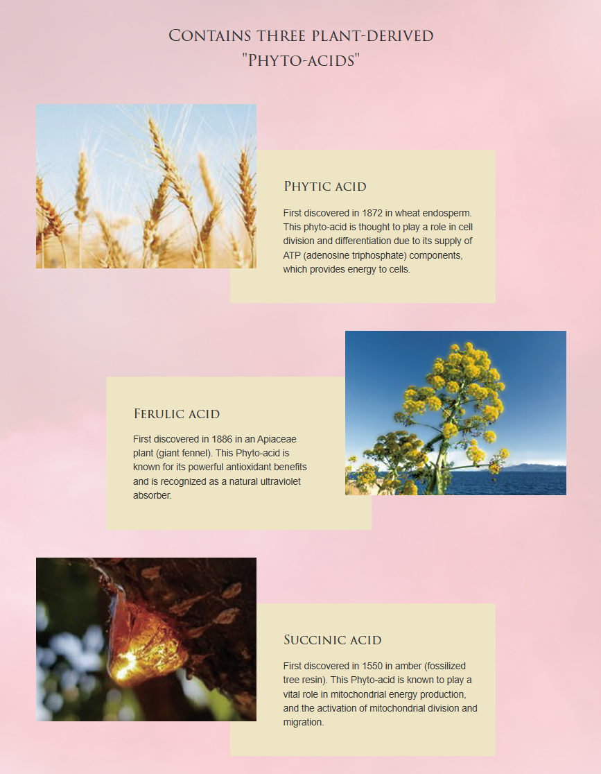 Three types of phyto acids directly approach three key stages of the cell cycle to support the continuous rebirth of remarkably youthful “ageless” cells throughout the skin. Continued use offers greater promise of fresh levels of skin beauty.