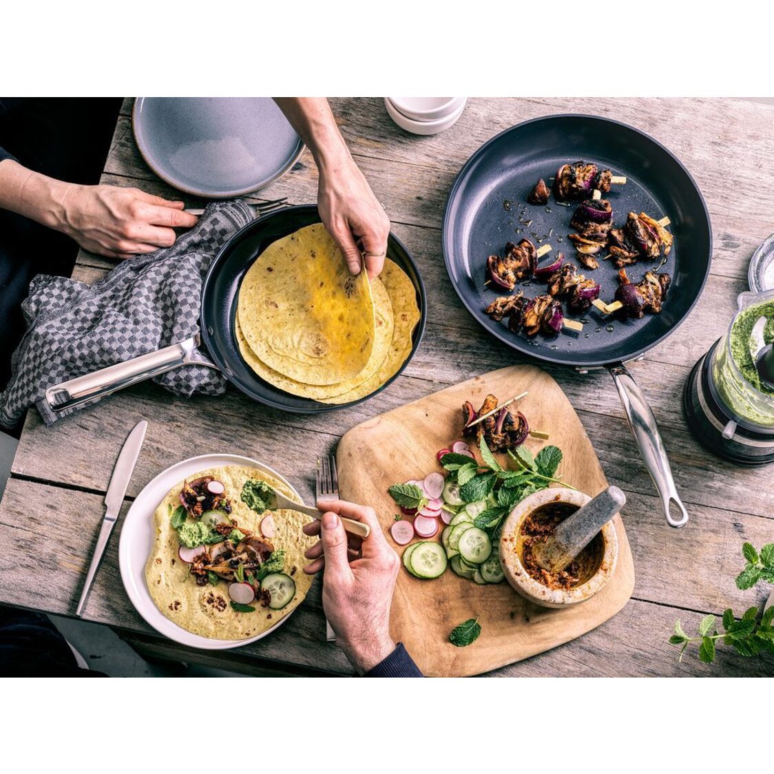 24cm casserole & cover, 24cm steamer, 20cm frypan, 28cm frypan.