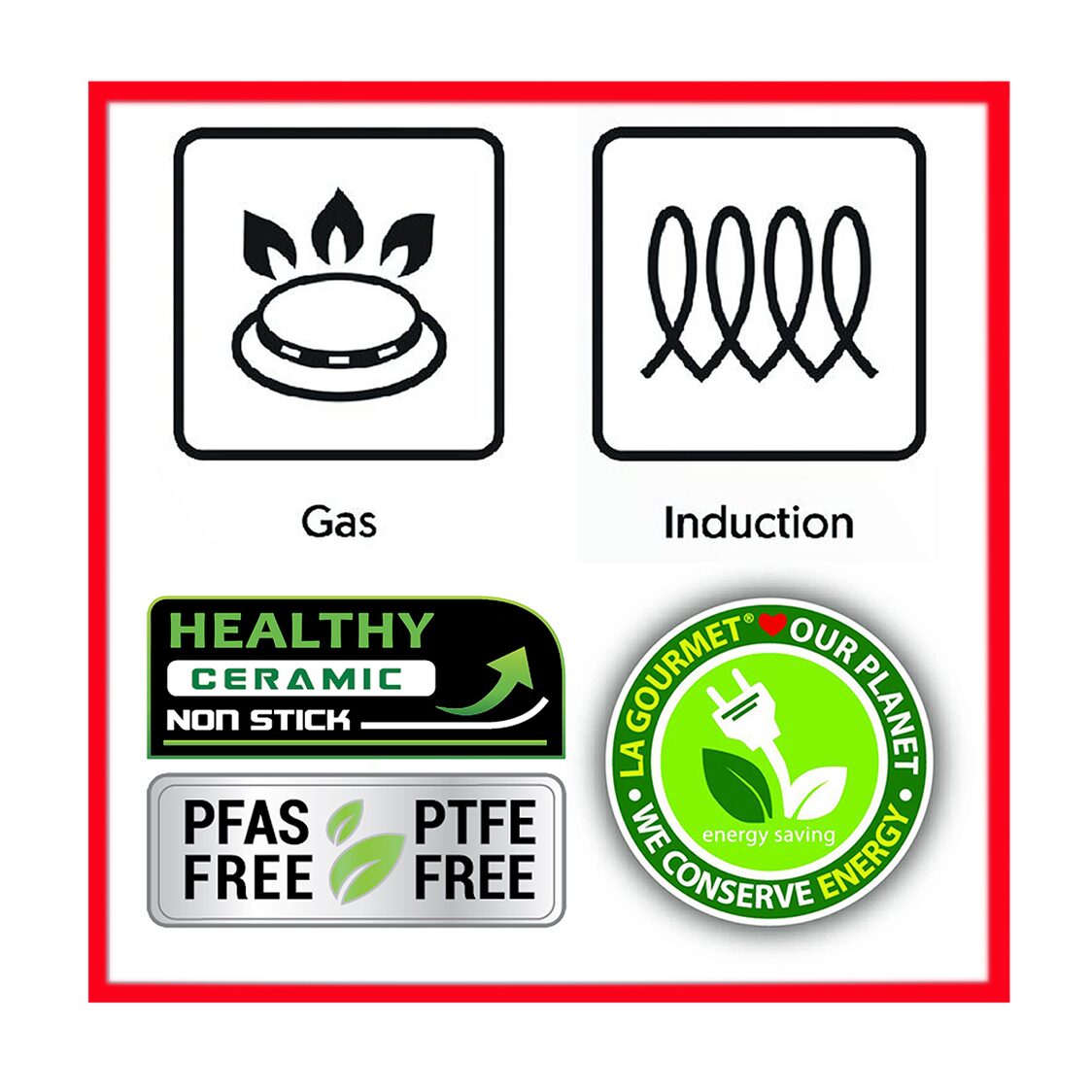 Since 1990, La gourmet® has focused on conserving energy and healthy living, with Shogun by La gourmet® offering safe, high-quality cookware for convenient cooking. The Ceragan™ Ceramic Non-stick coating is PFAS- and PTFE-free, free from harmful substances, and provides extreme hardness, high scratch resistance, and easy-to-clean non-stick performance. Reinforced with ceramic and pearl powder through Sol Gel technology, it ensures durability and safety with FDA and LFGB compliance. The die-cast aluminium body, 4.5–5mm thick at the base, is strong yet lightweight, delivering excellent heat distribution and energy efficiency. Its induction base makes it versatile for all stoves, while the ceramic surface emits far-infrared radiation that enhances flavor and reduces energy consumption.