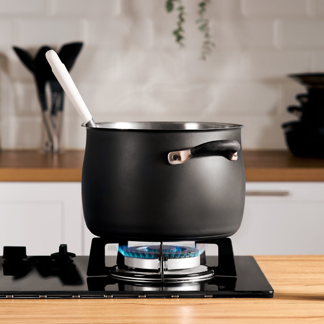 - Clever stainless steel stopper that prevents the tool from sliding into pots and pans.