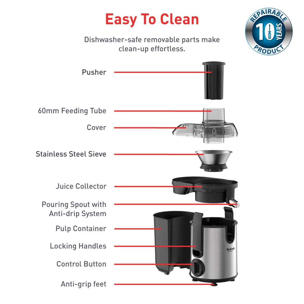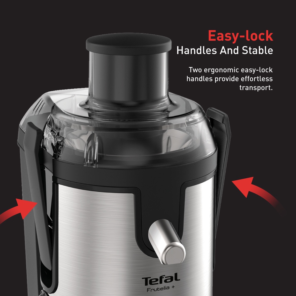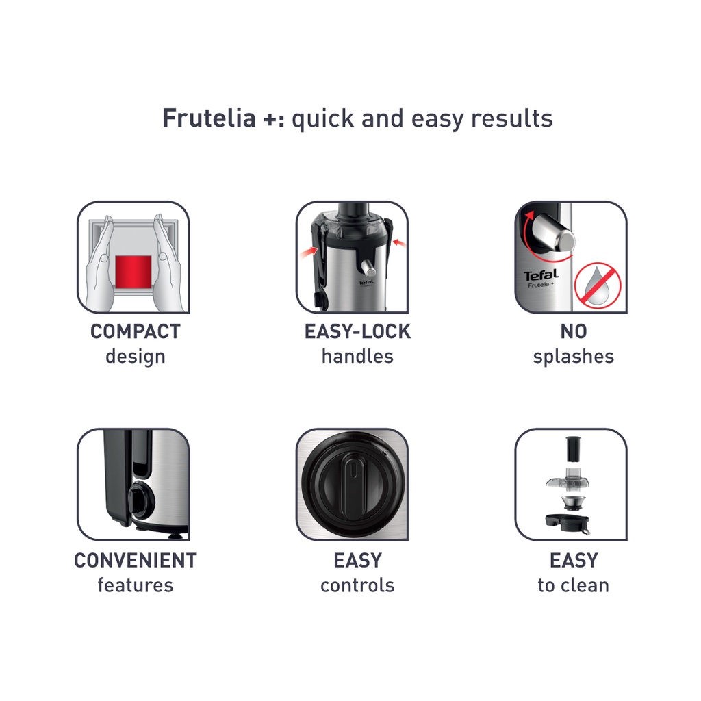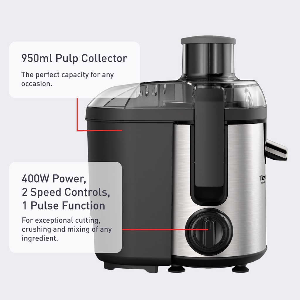 The Tefal Frutelia + juicer provides perfect results for all your favorite juices, for the easiest way to enjoy healthy, delicious fresh juices every day. A wide opening lets you insert large chunks or entire pieces of fruit with total ease, while 400W of power comes together with 2-speed control and a pulse function for flawless cutting, crushing and mixing. All this with elegant inox finishes to fit perfectly your kitchen style.